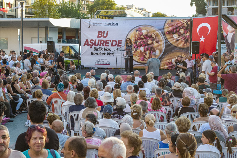 Karşıyaka Belediyesi’nin geleneksel hale getirdiği Aşure Günü etkinliği, bu yıl da büyük coşku ve yoğun katılımla gerçekleşti. Birlik ve beraberlik dilekleriyle karılan aşurenin bereketi, yaklaşık üç bin vatandaşla paylaşıldı. Belediye Başkanı Yıldız Ünsal “Bu güzel günü anlamlandıran tüm katılımcılara ve emek veren derneklerimize teşekkür ediyorum” dedi.